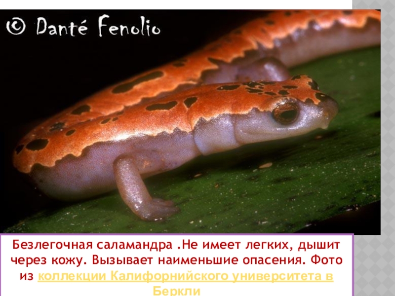 Слайд 59Безлегочная саламандра .Не имеет легких, дышит через кожу. Вызывает наименьшие опасения.