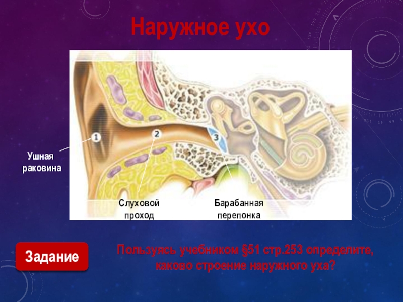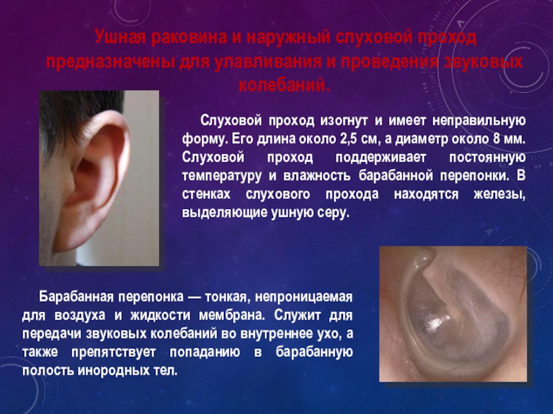 Слуховой проход изогнут и имеет неправильную форму. Его длина около 2,5 см, а диаметр около 8 мм. Слуховой проход поддерживает постоянную температуру и влажность барабанной перепонки. В стенках слухового прохода находятся железы, выделяющие ушную серу.