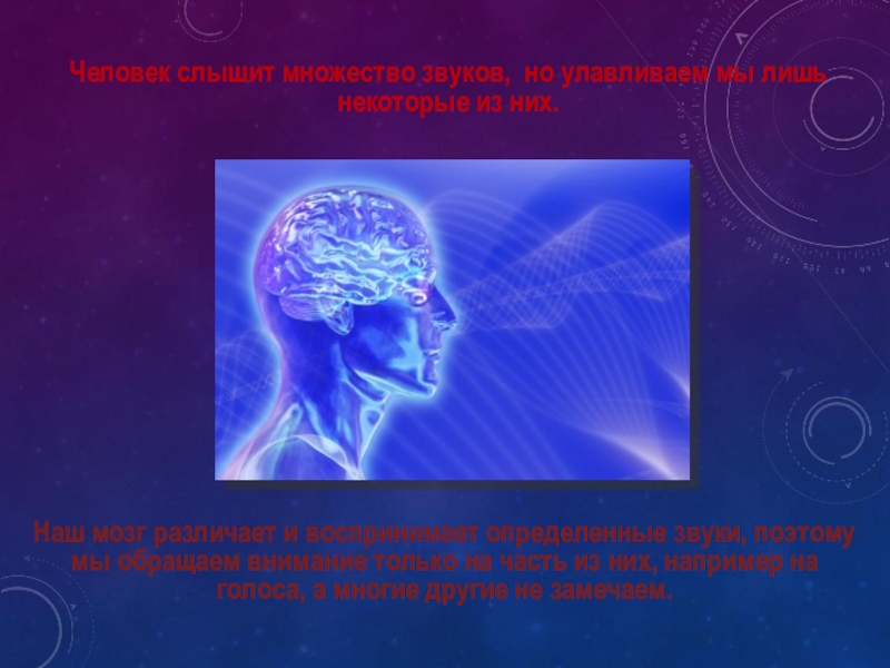 Наш мозг различает и воспринимает определенные звуки, поэтому мы обращаем внимание только на часть из них, например на голоса, а многие другие не замечаем.