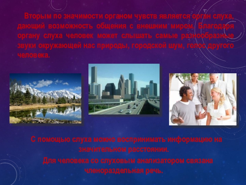 С помощью слуха можно воспринимать информацию на значительном расстоянии.
