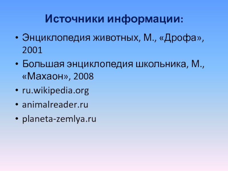 Источники информации:Энциклопедия животных, М., «Дрофа», 2001Большая энциклопедия школьника, М., «Махаон», 2008ru.wikipedia.organimalreader.ruplaneta-zemlya.ru