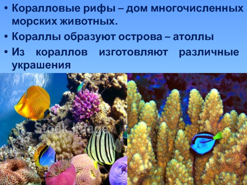 Коралловые рифы – дом многочисленных морских животных.Кораллы образуют острова – атоллыИз кораллов изготовляют различные украшения