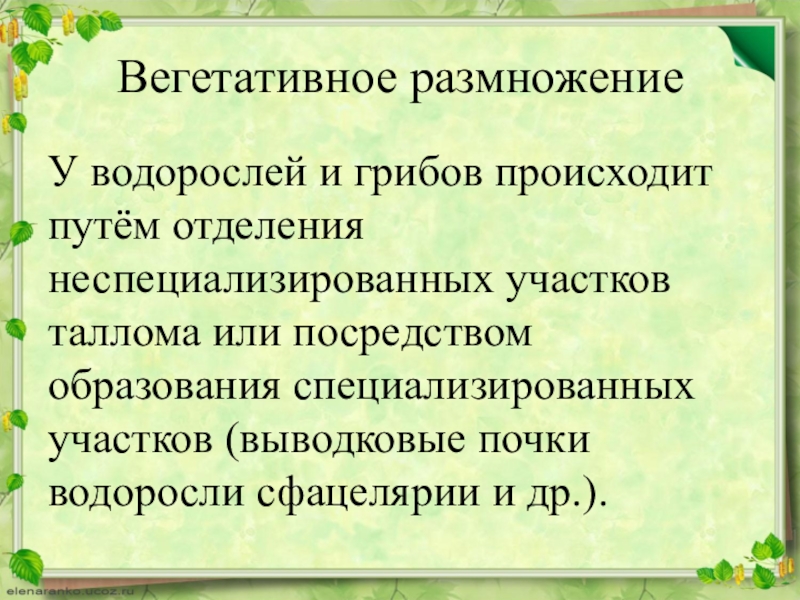 таллома или посредством образования специализированных участков (выводковые почки водоросли сфацелярии и др.).
