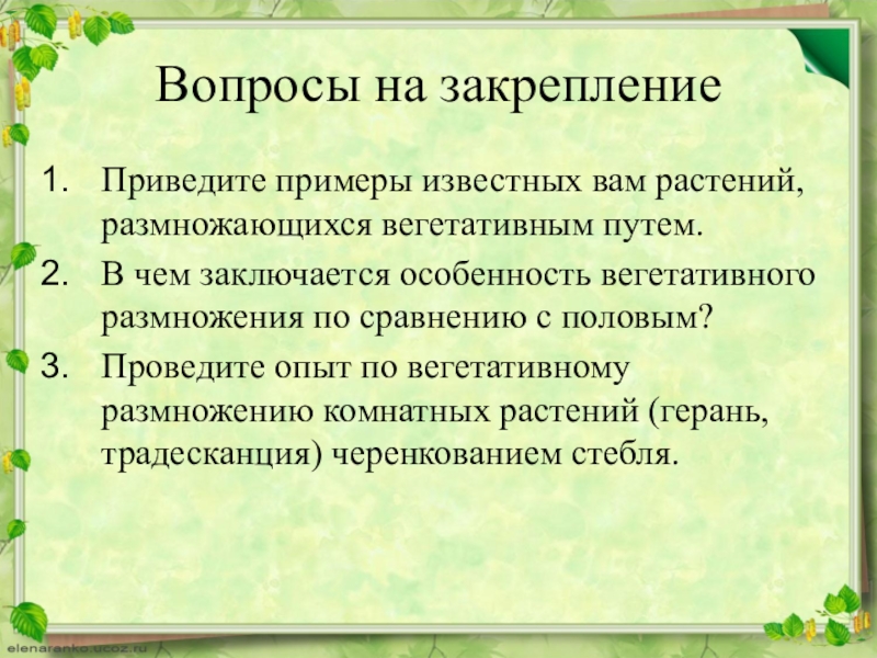 Вопросы на закреплениеПриведите примеры известных вам растений, размножающихся вегетативным путем. В чем заключается особенность вегетативного размножения по