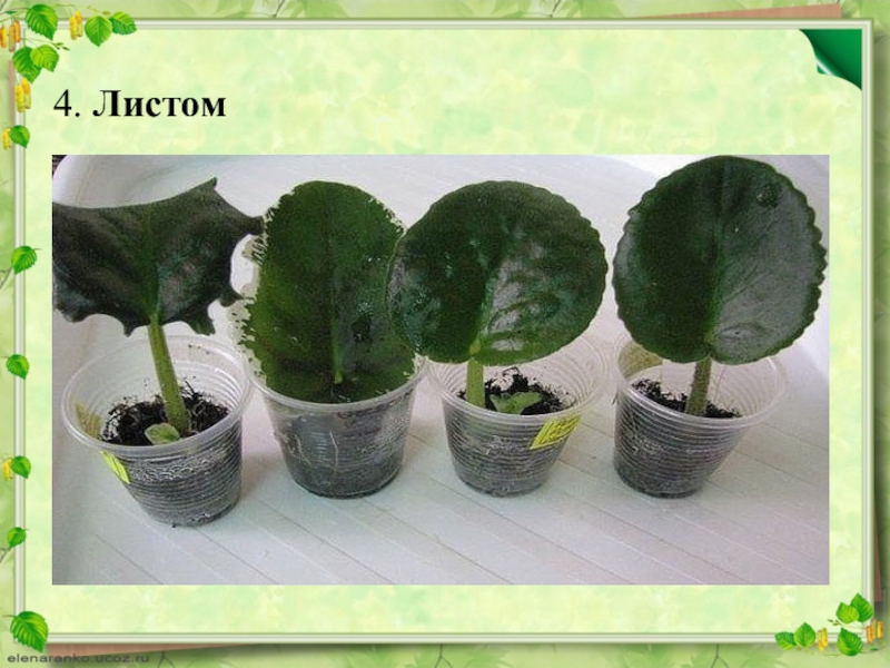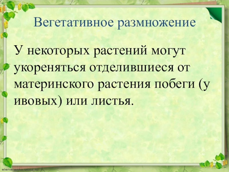 Вегетативное размножение У некоторых растений могут укореняться отделившиеся от материнского растения побеги (у ивовых) или листья.