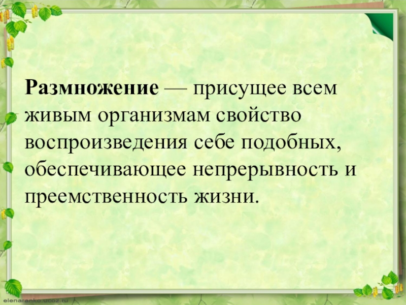 Слайд 2Размножение — присущее всем живым организмам свойство воспроизведения себе подобных, обеспечивающее