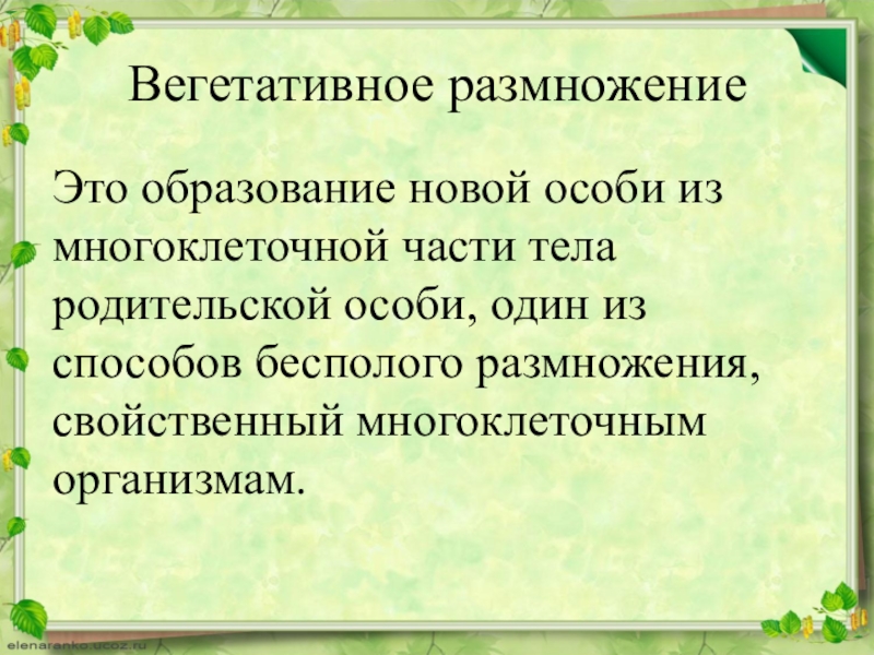 Вегетативное размножение Это образование новой особи из многоклеточной части тела родительской особи, один из способов бесполого размножения,