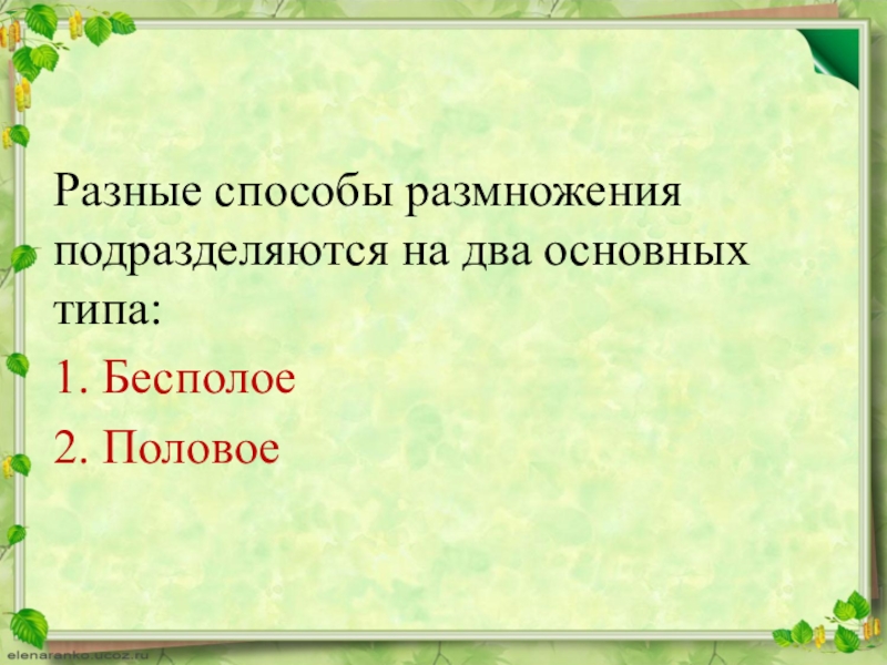 Разные способы размножения подразделяются на два основных типа: 1. Бесполое 2. Половое