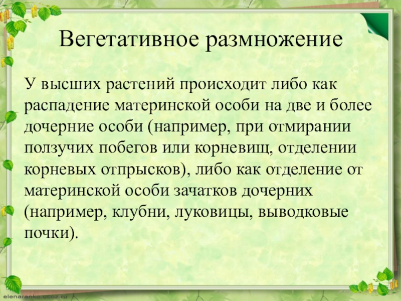Вегетативное размножение У высших растений происходит либо как распадение материнской особи на две и более дочерние особи