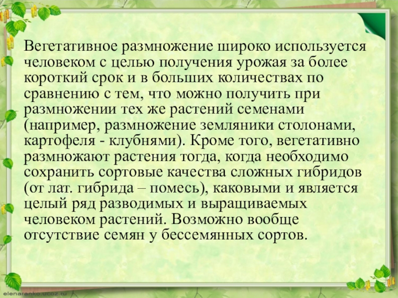 короткий срок и в больших количествах по сравнению с тем, что можно получить при размножении тех же растений семенами (например, размножение земляники столонами, картофеля - клубнями). Кроме того, вегетативно размножают растения тогда, когда необходимо сохранить сортовые качества сложных гибридов (от лат. гибрида – помесь), каковыми и является целый ряд разводимых и выращиваемых человеком растений. Возможно вообще отсутствие семян у бессемянных сортов.