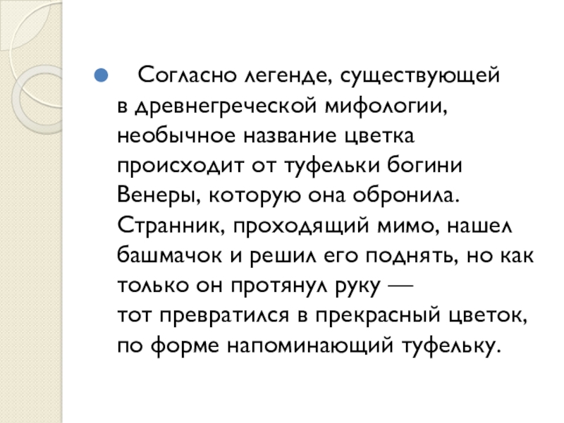 от туфельки богини Венеры, которую она обронила. Странник, проходящий мимо, нашел башмачок и решил его поднять, но как только он протянул руку — тот превратился в прекрасный цветок, по форме напоминающий туфельку.