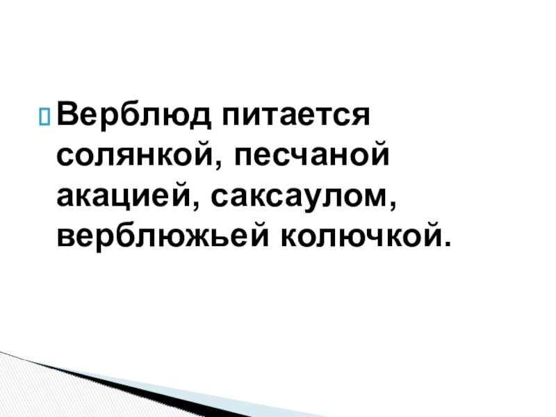 Презентация, доклад по биологии Верблюд. Особенности внешнего строения. Приспособленность к засушливым условиям жизни. Особенности питания верблюда. Значение верблюда в народном хозяйстве.