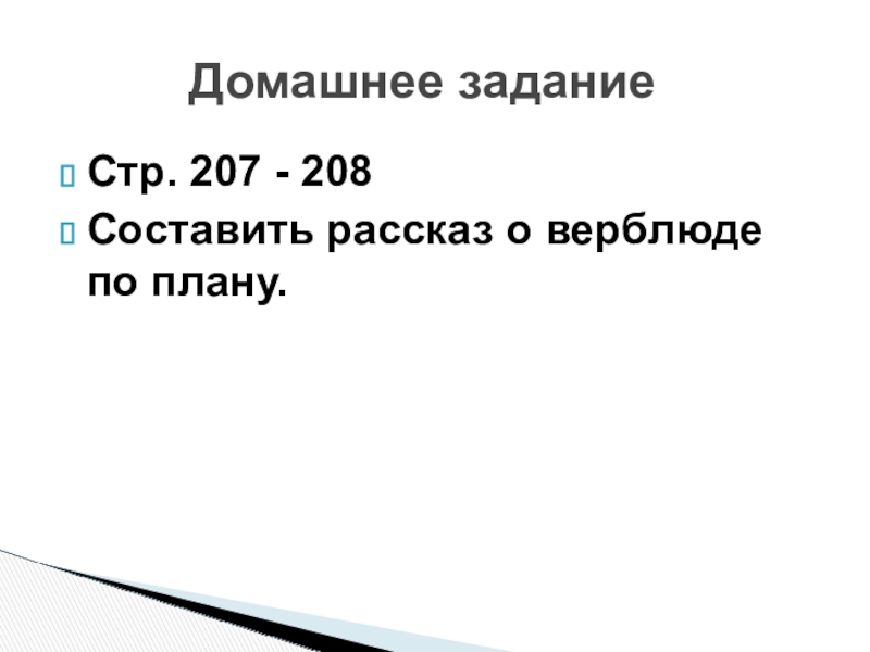 Домашнее задание Стр. 207 - 208Составить рассказ о верблюде по плану.