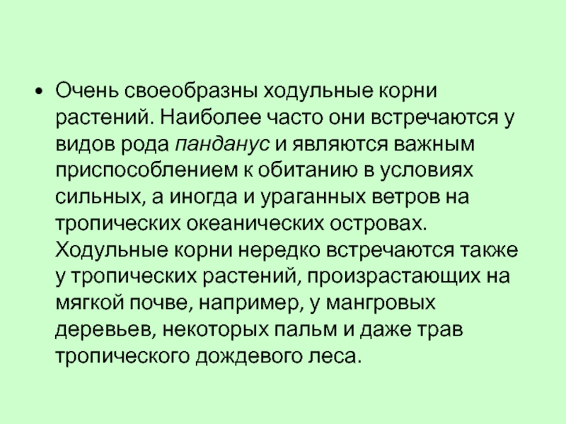 рода панданус и являются важным приспособлением к обитанию в условиях сильных, а иногда и ураганных ветров на тропических океанических островах. Ходульные корни нередко встречаются также у тропических растений, произрастающих на мягкой почве, например, у мангровых деревьев, некоторых пальм и даже трав тропического дождевого леса.