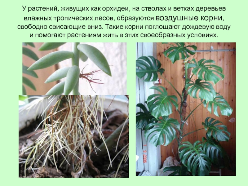 тропических лесов, образуются воздушные корни, свободно свисающие вниз. Такие корни поглощают дождевую воду и помогают растениям жить в этих своеобразных условиях.