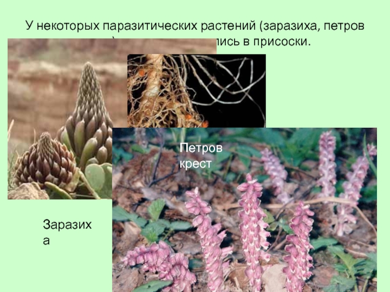 Слайд 24У некоторых паразитических растений (заразиха, петров крест) корни превратились в присоски.