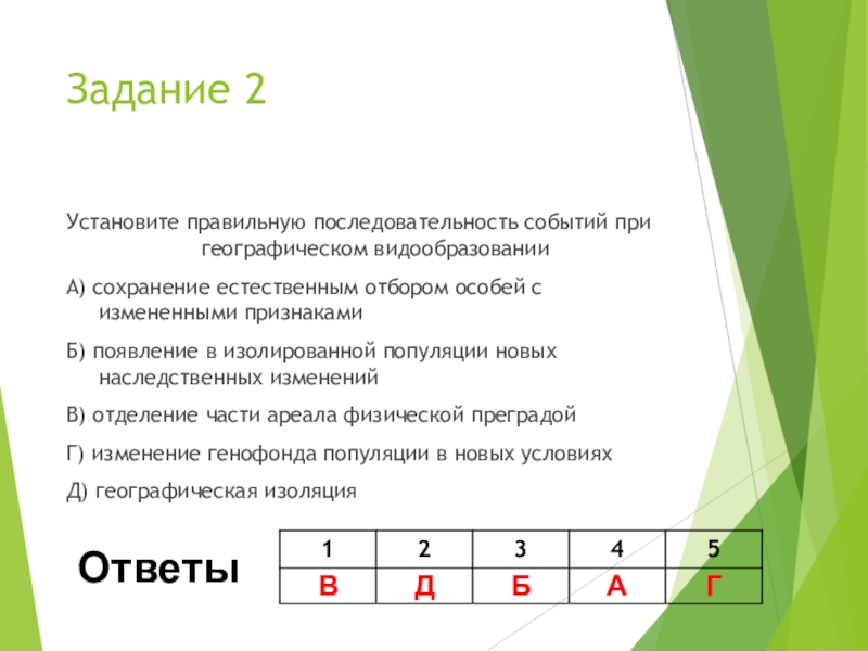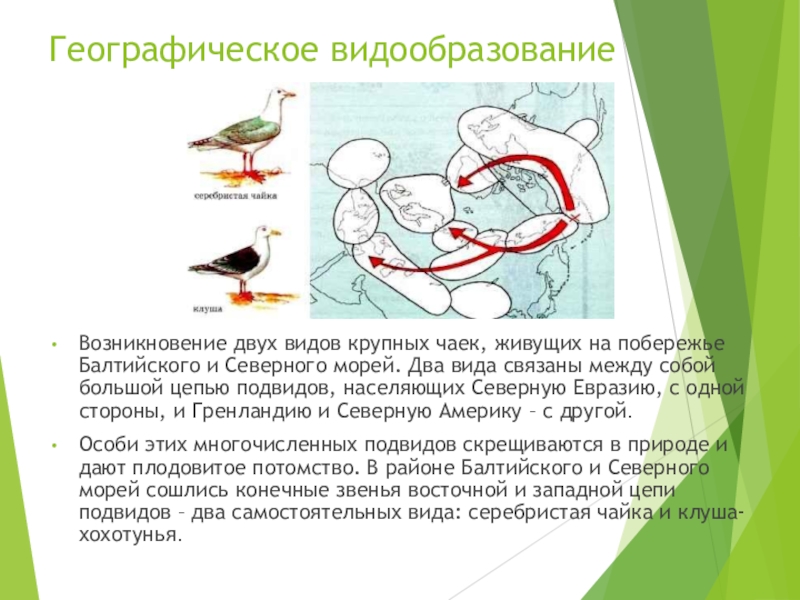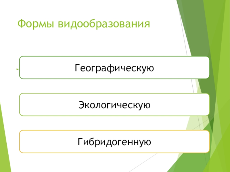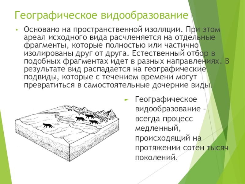 Основано на пространственной изоляции. При этом ареал исходного вида расчленяется на отдельные фрагменты, которые полностью или частично изолированы друг от друга. Естественный отбор в подобных фрагментах идет в разных направлениях. В результате вид распадается на географические подвиды, которые с течением времени могут превратиться в самостоятельные дочерние виды.