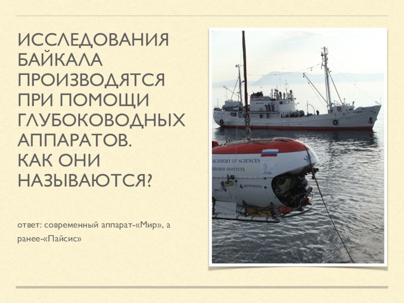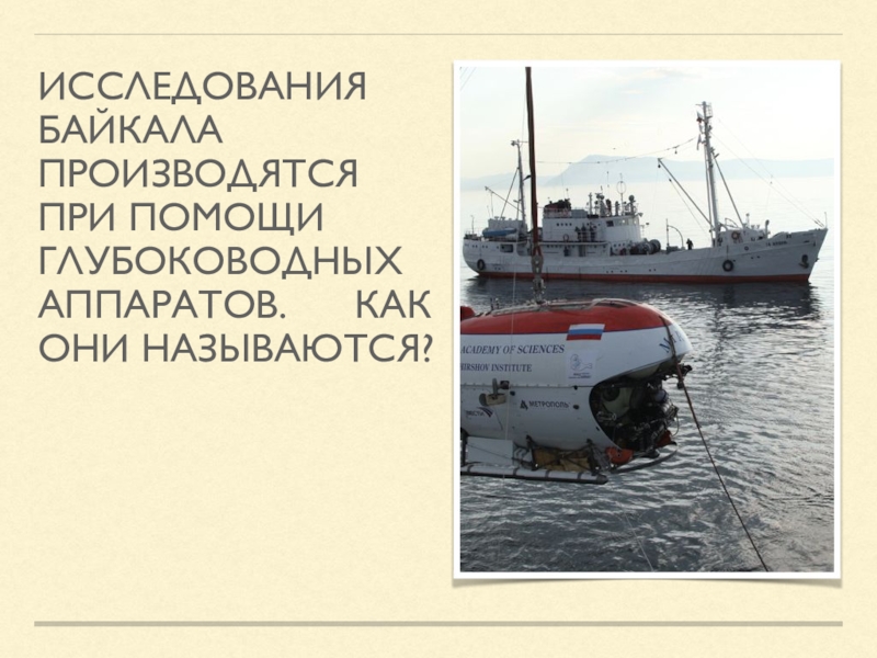 Слайд 31исследования байкала производятся при помощи глубоководных аппаратов. как они называются?
