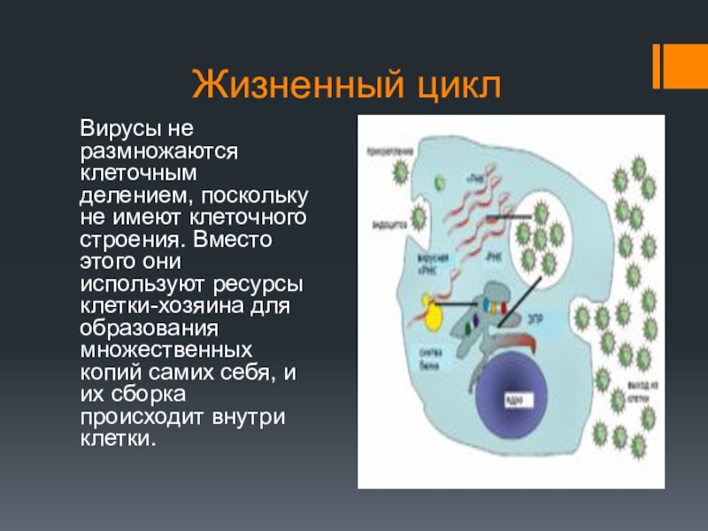 Жизненный циклВирусы не размножаются клеточным делением, поскольку не имеют клеточного строения. Вместо этого они используют ресурсы клетки-хозяина