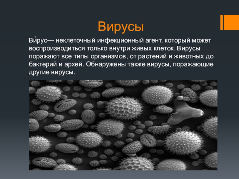 ВирусыВи́рус— неклеточный инфекционный агент, который может воспроизводиться только внутри живых клеток. Вирусы поражают все типы организмов, от
