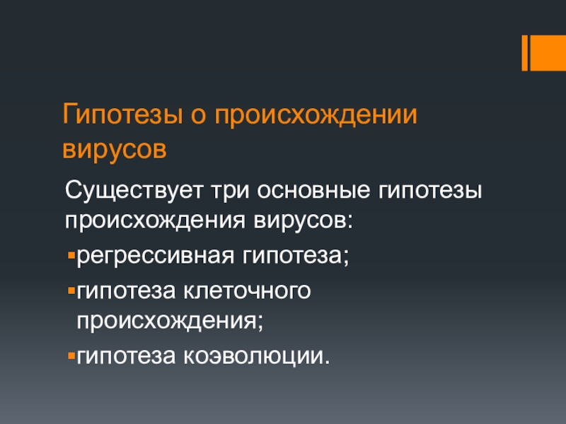 Гипотезы о происхождении вирусовСуществует три основные гипотезы происхождения вирусов:регрессивная гипотеза;гипотеза клеточного происхождения;гипотеза коэволюции.