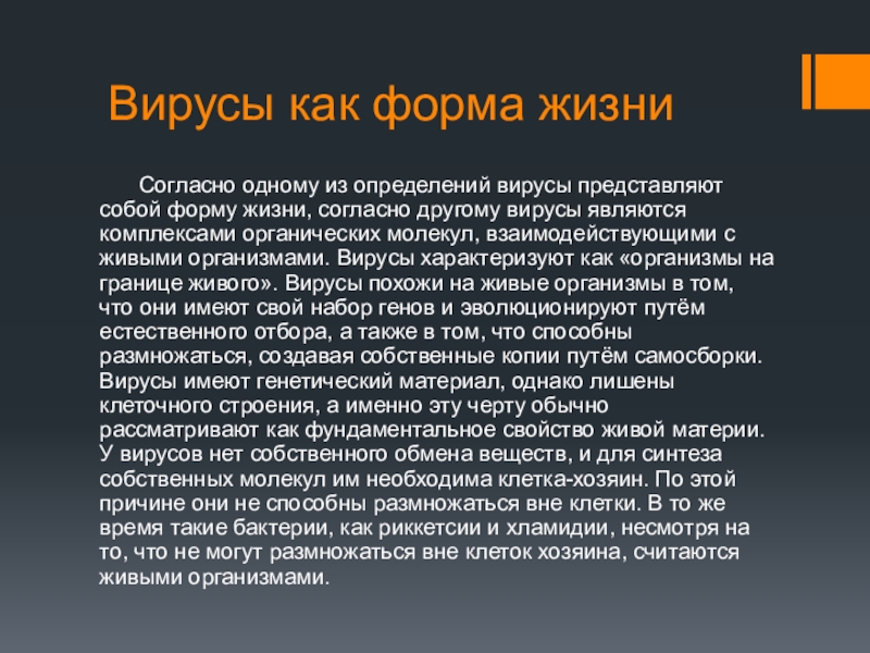 жизни, согласно другому вирусы являются комплексами органических молекул, взаимодействующими с живыми организмами. Вирусы характеризуют как «организмы на границе живого». Вирусы похожи на живые организмы в том, что они имеют свой набор генов и эволюционируют путём естественного отбора, а также в том, что способны размножаться, создавая собственные копии путём самосборки. Вирусы имеют генетический материал, однако лишены клеточного строения, а именно эту черту обычно рассматривают как фундаментальное свойство живой материи. У вирусов нет собственного обмена веществ, и для синтеза собственных молекул им необходима клетка-хозяин. По этой причине они не способны размножаться вне клетки. В то же время такие бактерии, как риккетсии и хламидии, несмотря на то, что не могут размножаться вне клеток хозяина, считаются живыми организмами.