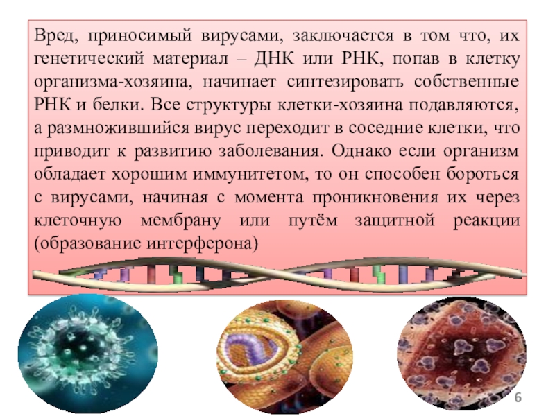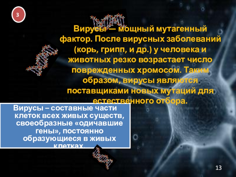Вирусы — мощный мутагенный фактор. После вирусных заболеваний (корь, грипп, и др.) у человека и животных резко возрастает число поврежденных хромосом. Таким образом, вирусы являются поставщиками новых мутаций для естественного отбора.