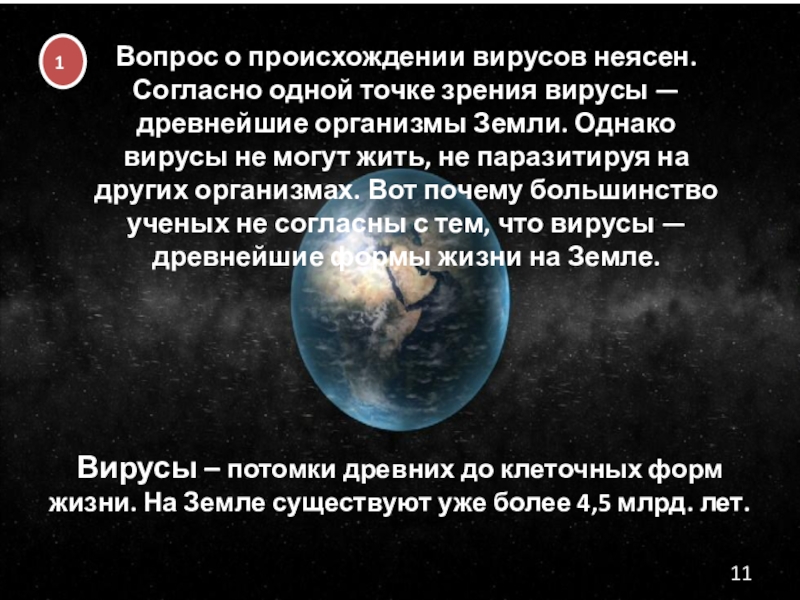 Вопрос о происхождении вирусов неясен. Согласно одной точке зрения вирусы — древнейшие организмы Земли. Однако вирусы не могут жить, не паразитируя на других организмах. Вот почему большинство ученых не согласны с тем, что вирусы — древнейшие формы жизни на Земле.