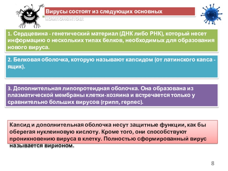1. Сердцевина - генетический материал (ДНК либо РНК), который несет информацию о нескольких типах белков, необходимых для образования нового вируса.