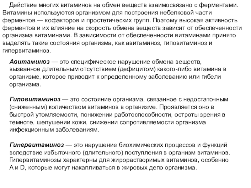 Гиповитаминоз — это состояние организма, связанное с недостаточным (сниженным) количеством витаминов в организме. Проявляется оно в быстрой утомляемости, понижении работоспособности, остроты зрения в темноте, шелушении кожи, снижении сопротивляемости организма инфекционным заболеваниям.
