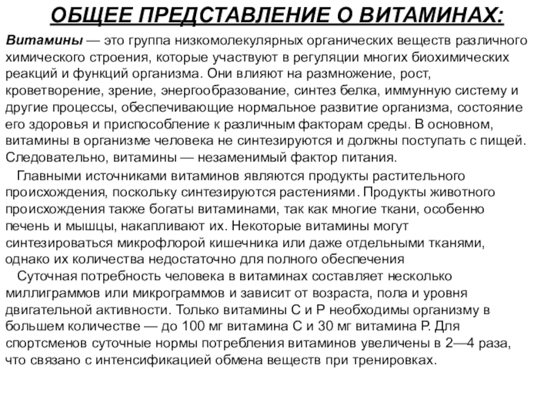 Суточная потребность человека в витаминах составляет несколько миллиграммов или микрограммов и зависит от возраста, пола и уровня двигательной активности. Только витамины С и Р необходимы организму в большем количестве — до 100 мг витамина С и 30 мг витамина Р. Для спортсменов суточные нормы потребления витаминов увеличены в 2—4 раза, что связано с интенсификацией обмена веществ при тренировках.
