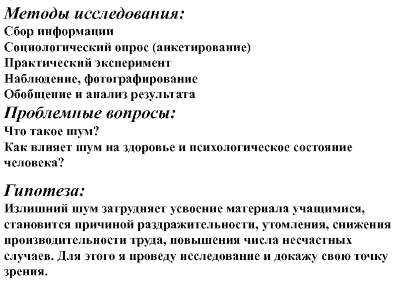 Излишний шум затрудняет усвоение материала учащимися, становится причиной раздражительности, утомления, снижения производительности труда, повышения числа несчастных случаев. Для этого я проведу исследование и докажу свою точку зрения.