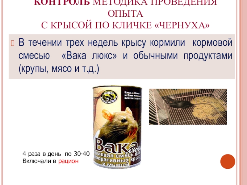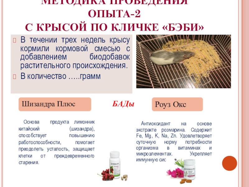 Биологически-активные добавки влияют на быстрый обмен веществ, что поспособствовало улучшению качества шерсти крысы и быстрому увеличению массы тела.