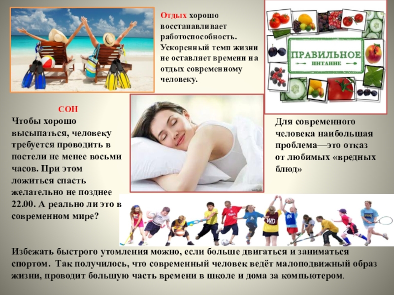 Отдых хорошо восстанавливает работоспособность. Ускоренный темп жизни не оставляет времени на отдых современному человеку.