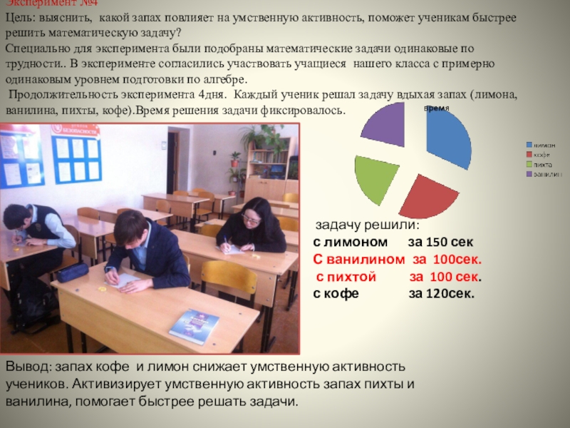 Продолжительность эксперимента 4дня. Каждый ученик решал задачу вдыхая запах (лимона, ванилина, пихты, кофе).Время решения задачи фиксировалось.