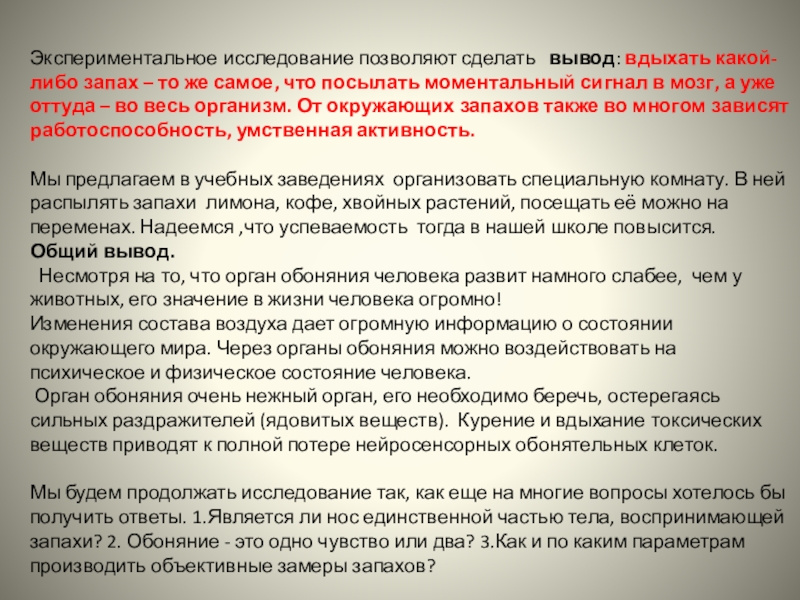 Слайд 23Экспериментальное исследование позволяют сделать вывод: вдыхать какой-либо запах – то