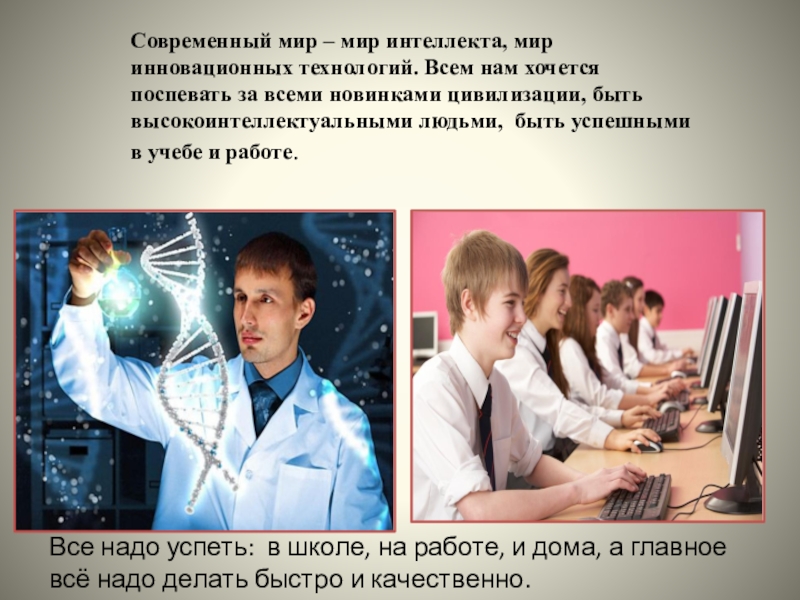 Слайд 3Современный мир – мир интеллекта, мир инновационных технологий. Всем нам хочется