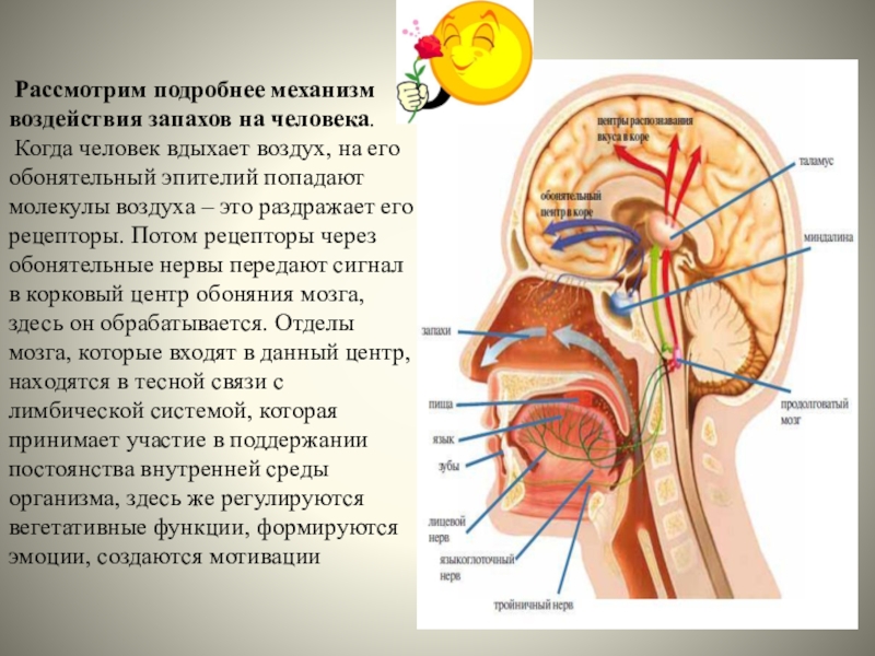 Слайд 10 Рассмотрим подробнее механизм воздействия запахов на человека.