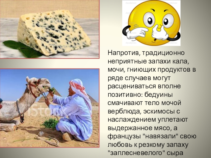 могут расцениваться вполне позитивно: бедуины смачивают тело мочой верблюда, эскимосы с наслаждением уплетают выдержанное мясо, а французы "навязали" свою любовь к резкому запаху "заплесневелого" сыра рокфор,
