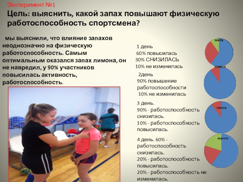мы выяснили, что влияние запахов неоднозначно на физическую работоспособность. Самым оптимальным оказался запах лимона, он не навредил, у 90% участников повысилась активность, работоспособность.