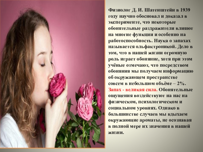 в эксперименте, что некоторые обонятельные раздражители влияют на многие функции и особенно на работоспособность. Наука о запахах называется ольфактроникой. Дело в том, что в нашей жизни огромную роль играет обоняние, хотя при этом учёные отмечают, что посредством обоняния мы получаем информацию об окружающем пространстве совсем в небольшом объёме – 2%. Запах - великая сила. Обонятельные ощущения воздействуют на нас на физическом, психологическом и социальном уровнях. Однако в большинстве случаев мы вдыхаем окружающие ароматы, не осознавая в полной мере их значения в нашей жизни.