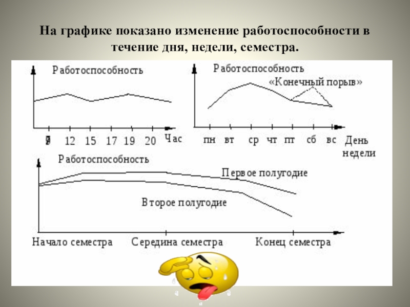 Слайд 6На графике показано изменение работоспособности в течение дня, недели, семестра.