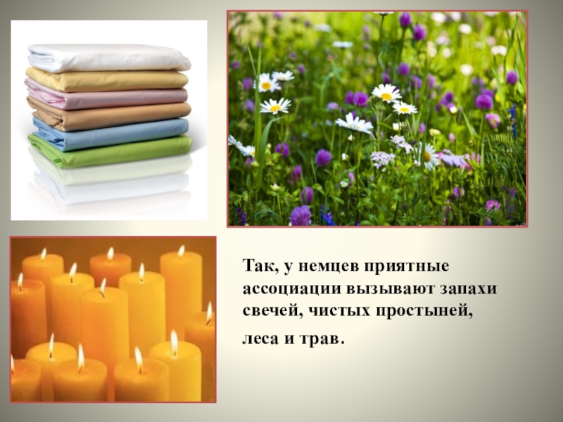 Слайд 12Так, у немцев приятные ассоциации вызывают запахи свечей, чистых простыней, леса