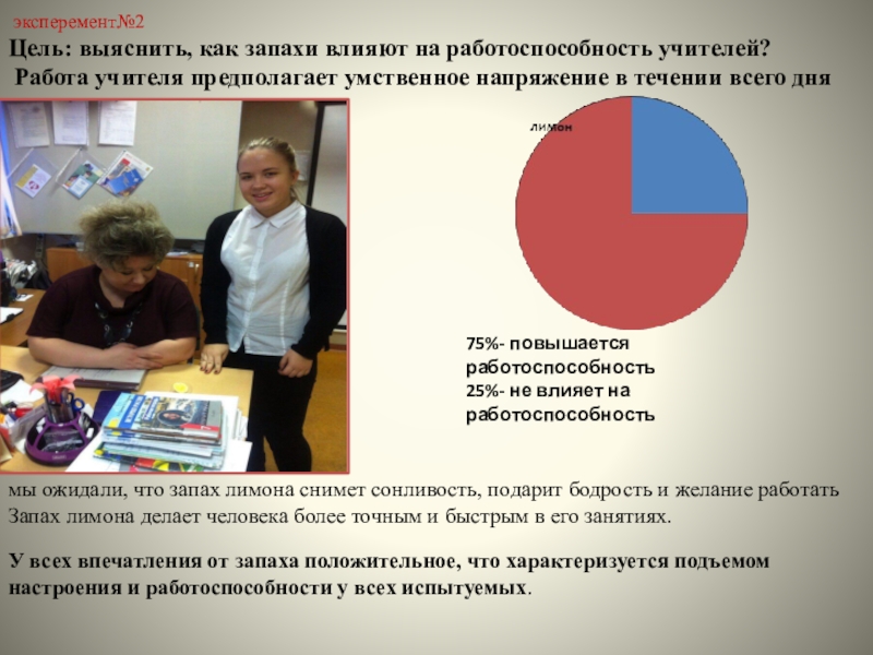 мы ожидали, что запах лимона снимет сонливость, подарит бодрость и желание работать Запах лимона делает человека более точным и быстрым в его занятиях.