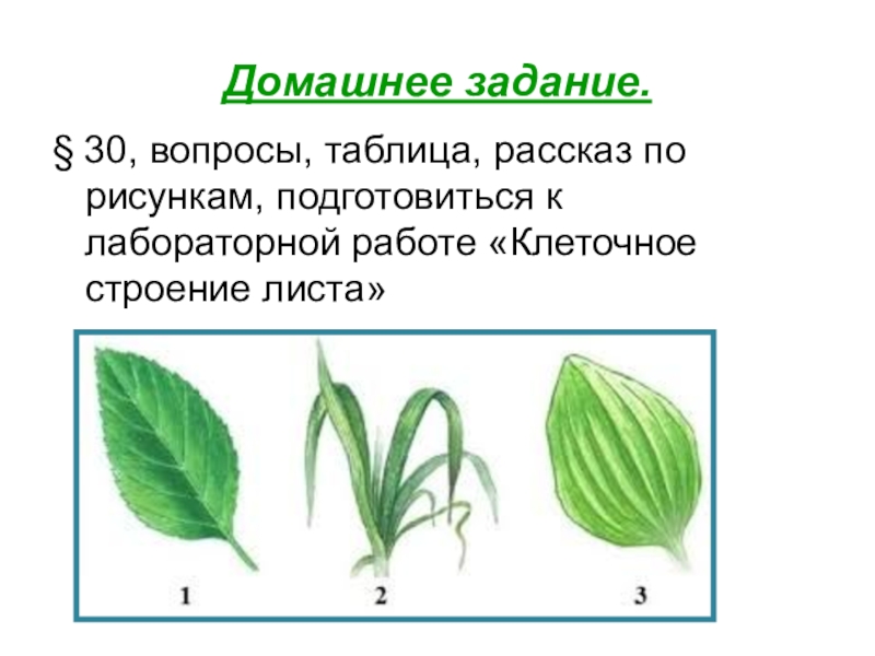 Домашнее задание.§ 30, вопросы, таблица, рассказ по рисункам, подготовиться к лабораторной работе «Клеточное строение листа»