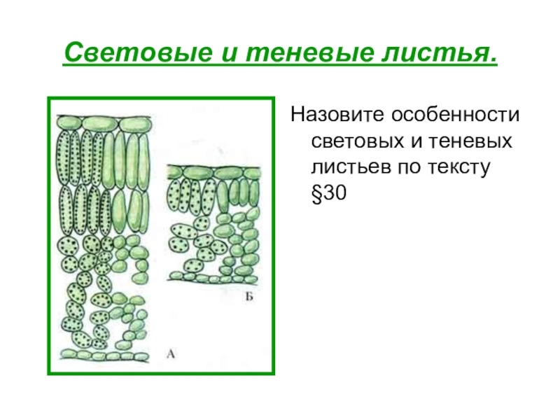Световые и теневые листья.Назовите особенности световых и теневых листьев по тексту §30