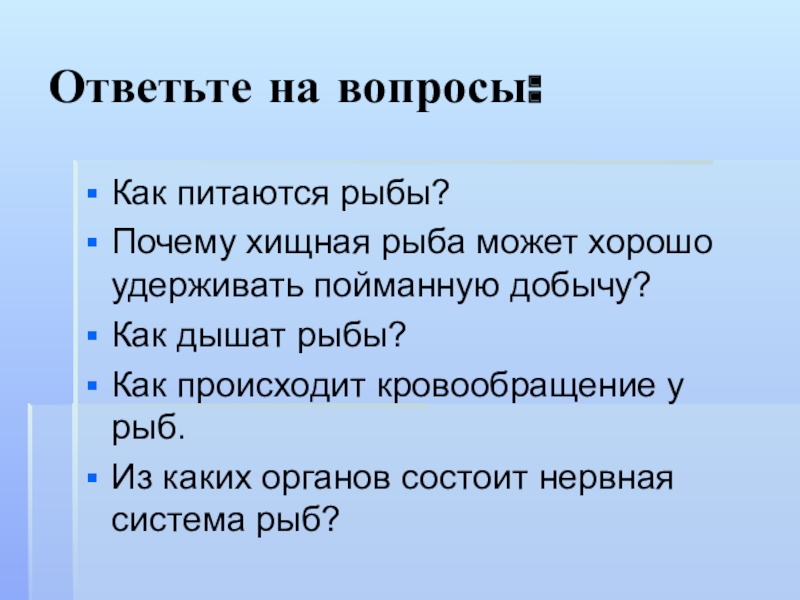 Ответьте на вопросы:Как питаются рыбы?Почему хищная рыба может хорошо удерживать пойманную добычу?Как дышат рыбы?Как происходит кровообращение у