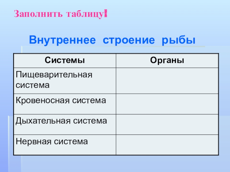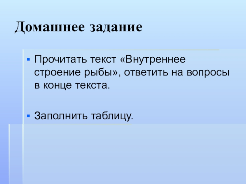 Домашнее заданиеПрочитать текст «Внутреннее строение рыбы», ответить на вопросы в конце текста.Заполнить таблицу.
