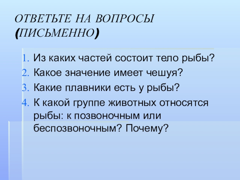 ОТВЕТЬТЕ НА ВОПРОСЫ (ПИСЬМЕННО)Из каких частей состоит тело рыбы?Какое значение имеет чешуя?Какие плавники есть у рыбы?К какой