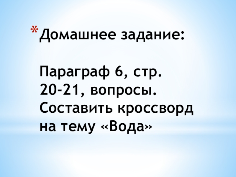 Слайд 23Домашнее задание: Параграф 6, стр. 20-21, вопросы. Составить кроссворд на тему «Вода»